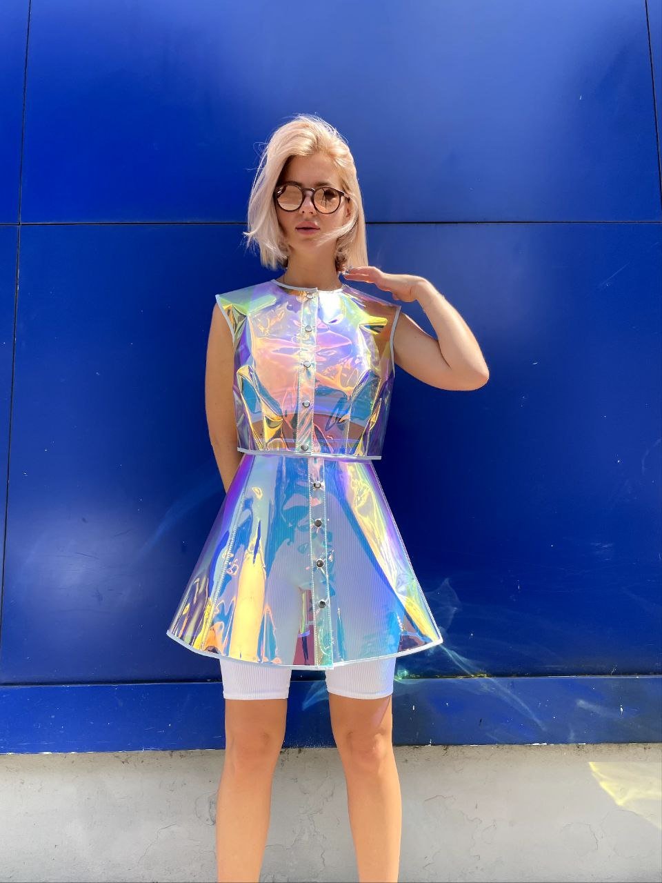 Light-Reactive Material: The unique transparent vinyl picks up ambient colors, making the outfit look different in every setting — from sunlight to neon lasers.