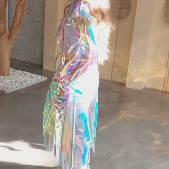 This isn't a coat; it’s a liquid rainbow you can wear. Our Holographic Vinyl Trench is the ultimate piece for those who live for the flash, the bass, and the "Where did you get that?" stares. Designed for festivals, raves, and anyone who thinks "too much" is just enough, this iridescent trench shifts colors with every heartbeat.